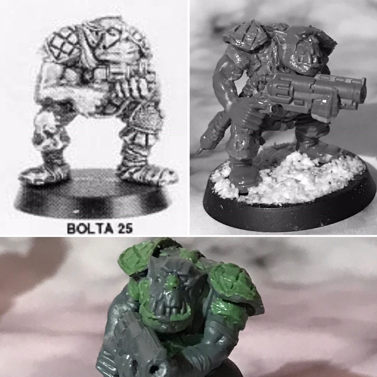 + I'm trying to get this across in my orks by downplaying the more exaggerated features and adding more military-style fatigues and armour. RT background originally had the orks as slavers; their equipment definitely manufactured rather than individually built, though there was still a (small c) chaotic sense of individuality. Basically, I want the orks to look like a tough, hardened militia. +